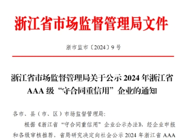 喜报丨晴天科技获评2024年浙江省 AAA 级“守合同重信用”企业