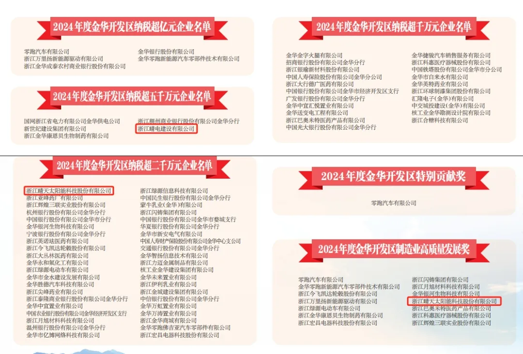 2025年2月12日,金华经济技术开发区召开2025年工作会议,会议全面总结了过去一年的经济发展成果,并对为开发区经济社会发展作出突出贡献的企业进行了表彰。晴天科技荣获“2024年度开发区高质量发展奖”,“2024年度开发区纳税超五千万元企业”、“2024年度开发区纳税超二千万企业”称号。值得一提的是,这已是晴天科技多次荣获“纳税超千万企业”称号,充分彰显了企业的综合实力与社会责任感。
